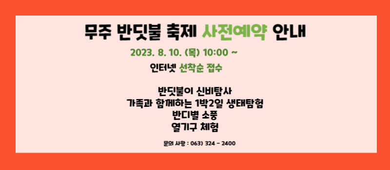 2023년 9월 2일(토)부터 9월 10일(일)까지 9일 동안 전북 무주에서 반딧불 축제가 시작됩니다. 올해 27회를 맞이하는 축제는 분주한 일상에서 벗어나, 자연에서의 신비한 경험들을 누릴 수 있는 "반딧불이 신비탐사" 등 다양한 체험 프로그램과 공연 및 전시. 관람 프로그램, 전통문화 재연공연들이 준비되어 있습니다. 가을로 접어드는 시기에 자연으로의 힐링 여행을 떠나 보시길 바랍니다.