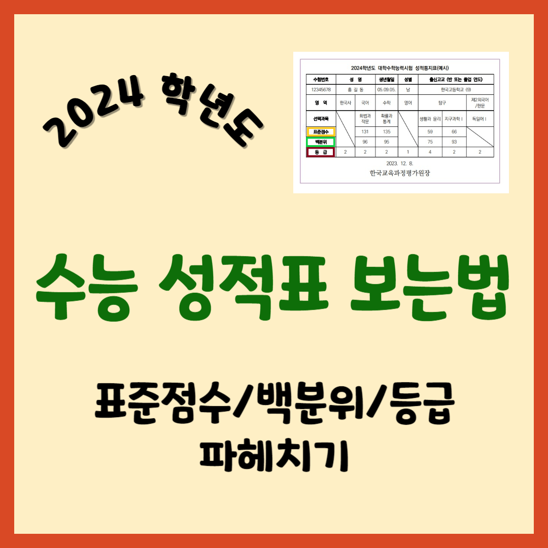올해 11월 16일 수능시험은 끝납니다. 12월 8일 수능 성적표를 받게 됩니다. 수능성적표에는 영역. 과목별 표준점수, 백분위, 등급이 적혀 있습니다. 각각의 용어가 무엇을 의미하는지, 성적표를 어떻게 보아야 하는지 알려드리겠습니다.
