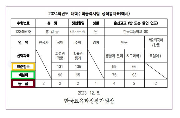 <2024학년도 대학수학능력시험 성적통지표:예시>